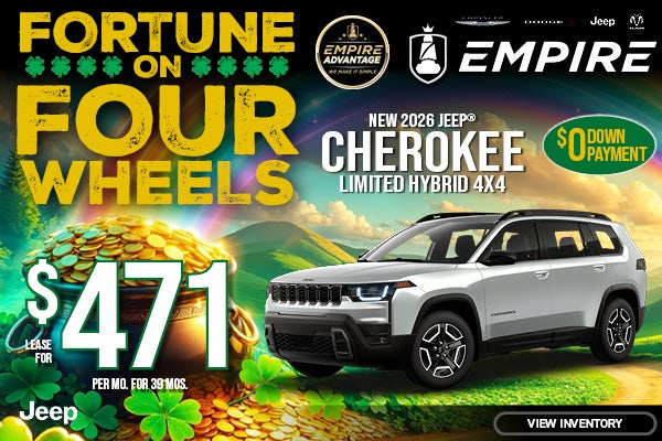 Stock #260398. MSRP $44,905. Lease example through Stellantis Financial Services for qualified lessees. $471 per month for 39 months with $1,966 total due at signing (first month’s payment $471 and acquisition fee $1,495). $0 down payment. Tax, title, license and registration fees extra. $175 dealer documentation fee not included. 7,500 miles per year. Lessee responsible for excess wear and mileage over 7,500 miles per year at $0.25 per mile. No security deposit required. Must qualify for Tier 1 credit and applicable lease loyalty incentive. Includes all applicable factory rebates and incentives. Offers cannot be combined. Dealer’s actual terms may vary. See dealer for details. Offer expires 03/31/2026.