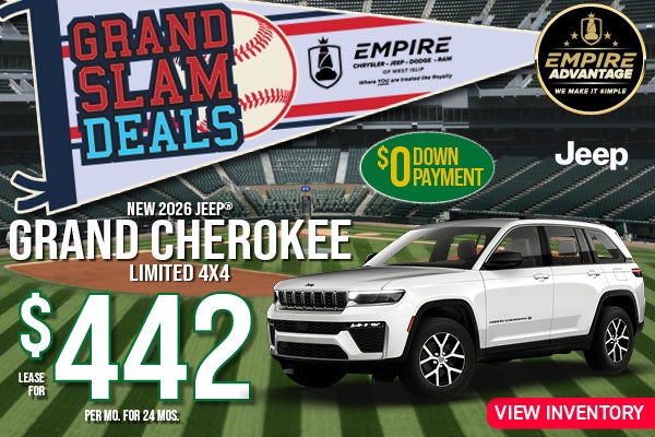Stock #260564. MSRP $48,140. Lease example for well-qualified lessees through Stellantis Financial Services. $442 per month for 24 months with $1445 total due at signing (first month’s payment $442, acquisition fee $595). $0 down payment. Tax, title, license and registration fees extra. $175 dealer documentation fee not included. 7,500 miles per year. Lessee responsible for excess wear and mileage over 7,500 miles per year at $0.25 per mile. No security deposit required. Must qualify for Tier 1 credit and 4xe Lease Loyalty incentive. Includes all applicable factory rebates and incentives. Offers cannot be combined. Dealer’s actual terms may vary. See dealer for complete details. Offer expires 04/30/2026.